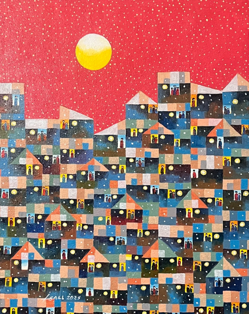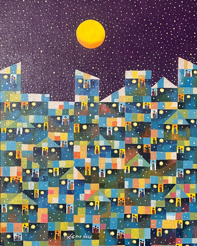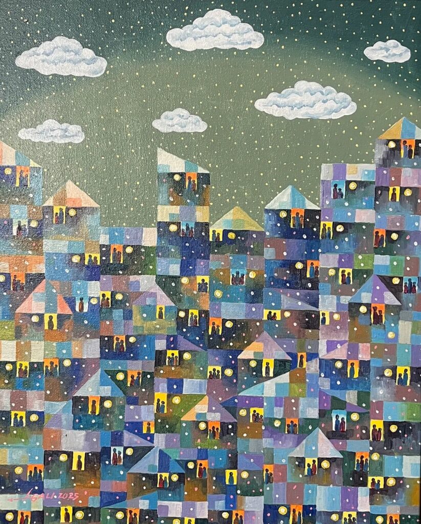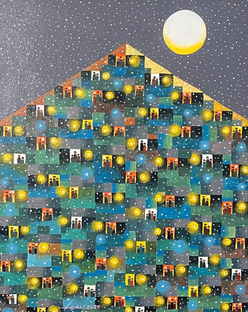 Gali’s signature style—characterized by fragmented perspectives and glowing light sources—unifies these diverse structures into a singular portrait of collective identity.